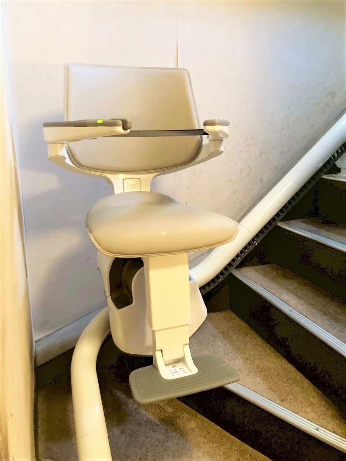 設置した階段昇降機の機種について屋内用の曲線型階段昇降機は幅の狭い階段でも乗れるよう自動旋回機能がついています! 下階と上階の乗り降りする位置を通路の邪魔にならないように、レールを曲げたり伸ばしたりして止めることができるところが曲線型の強いところです。 詳しくはこちらもご覧ください ⇒ 屋内曲線型 |