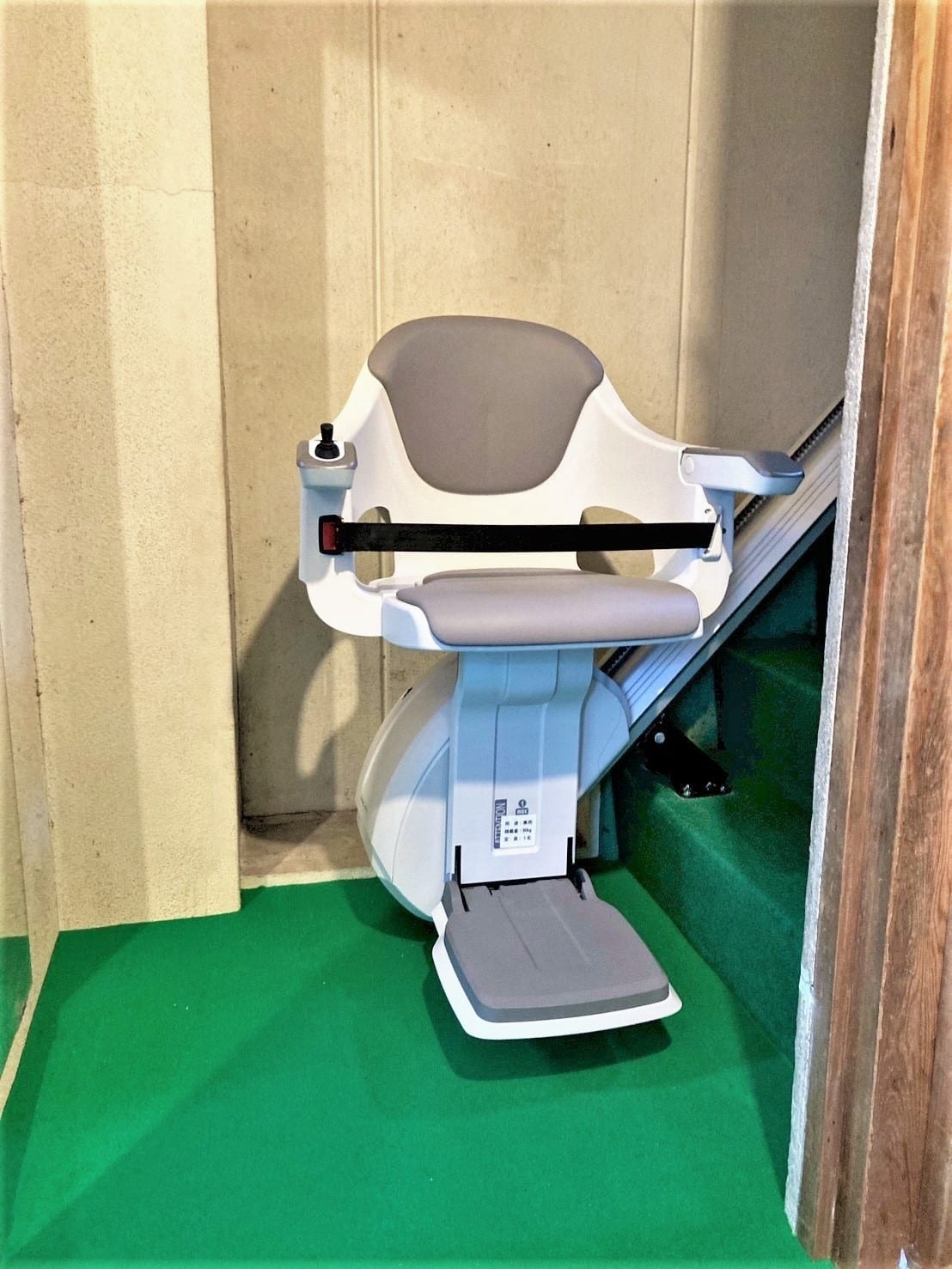 設置した階段昇降機の機種について屋内用直線型昇降機は真っすぐの階段に設置可能で、肘掛に昇りと下りの操作ボタンがあり、操作方法はとても簡単です。シートベルトもついており、速度は7.2/分、ゆっくり歩くスピードと同じぐらいなため安全性も優れております。 屋内直線型は上階に着くと手動で回転する手動式と、操作ボタンを押して自動で回転する自動式と種類が2つあり、こちらのご自宅で設置させていただいたのは手動式になります。 詳しくはこちらもご覧ください ⇒ 屋内用直線型階段昇降機(階段リフト) |