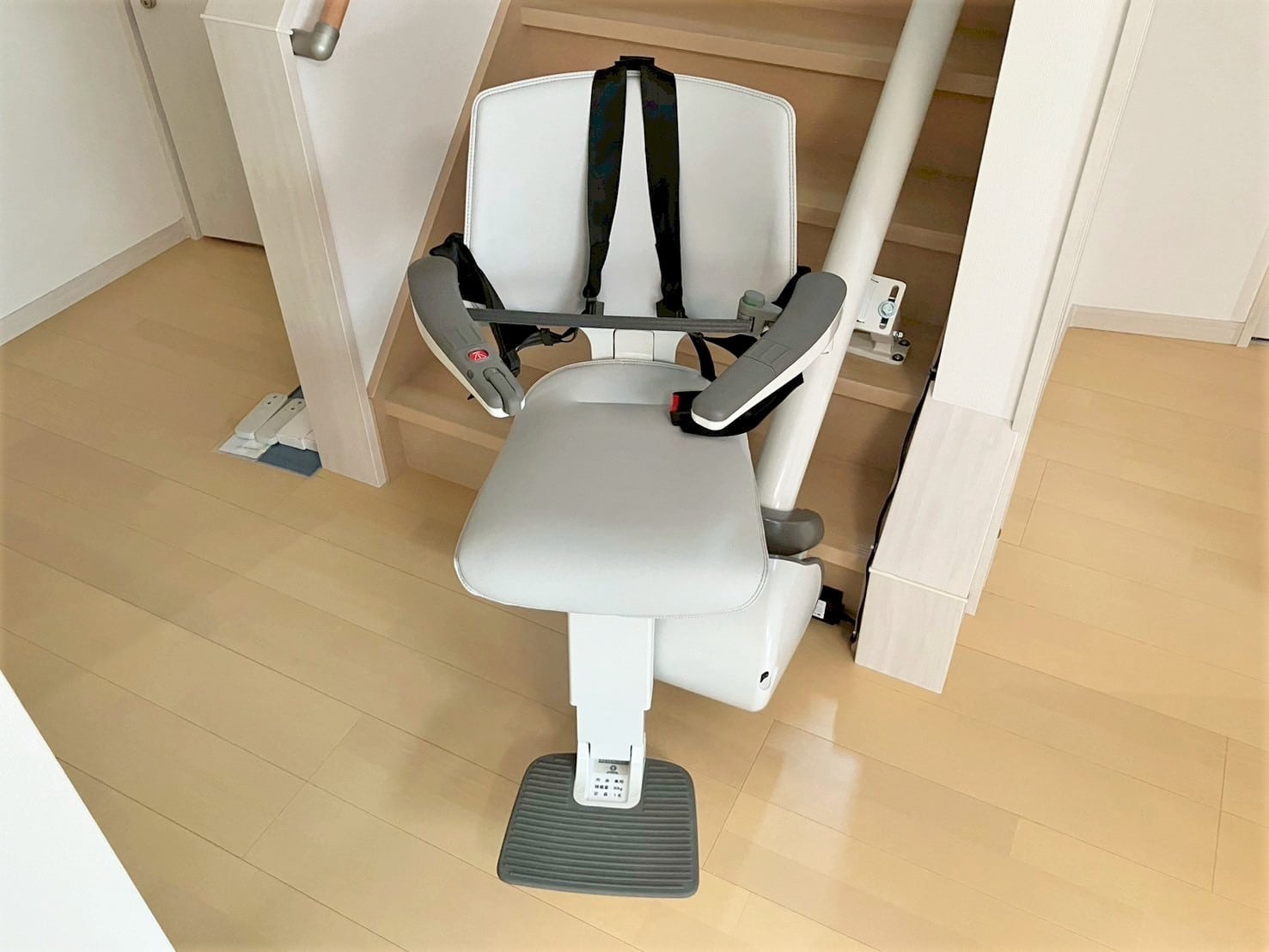 お取引先様よりご紹介いただき、現地調査をさせていただきました。ご利用者様は障害をお持ちのお子様がご使用されます。他社の製品も検討されていましたが、一番下の階段からわずか18センチほど出っ張りのあるレールレイアウト(垂直落とし)と4点シートベルトを気に入っていただき、ご注文をいただきました。